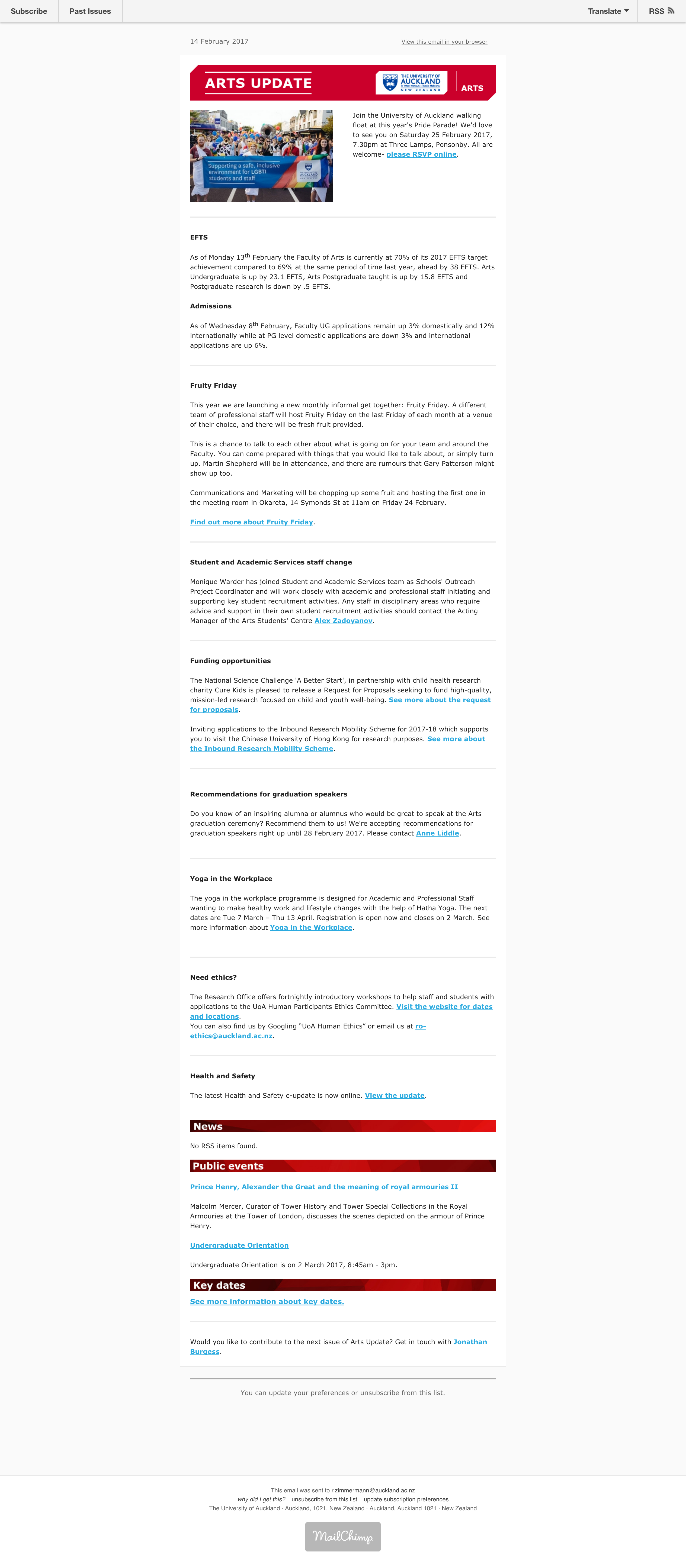 At the University of Auckland, I was in charge of collating material and processing it into a fortnightly e-newsletter distributed to all Arts staff.