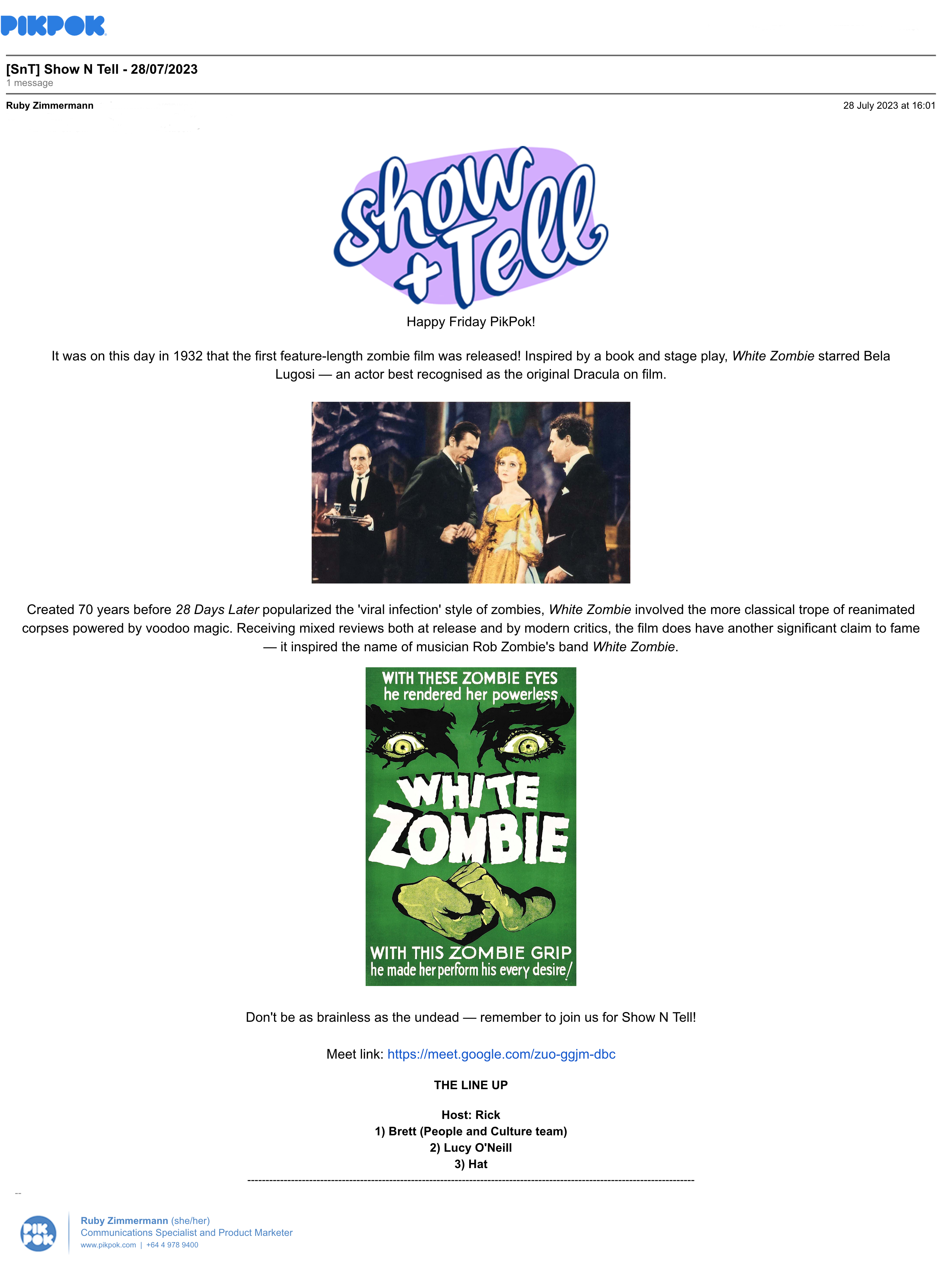 At PikPok, I send out a weekly email invitation to Show N Tell: the all-company social gathering on a Friday evening. I make sure that this email is a fun and light-hearted read just before the weekend, and encourages people to attend the event.