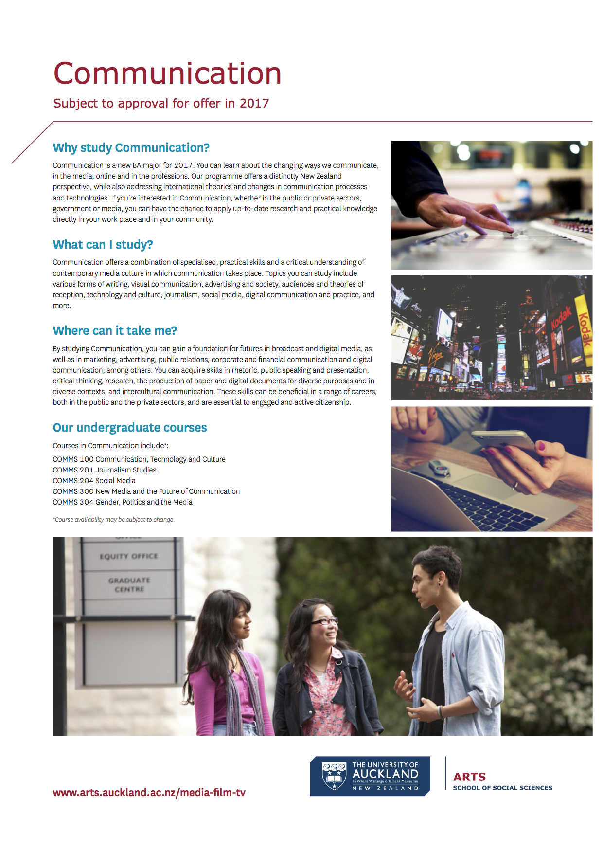 Over five years in the Faculty of Arts at the University of Auckland, I produced a large number of annual glossy publications. These were used for marketing purposes, as well as helping students to plan their degrees, settle into university life, navigate course options, and find support services. I wrote a large amount of the content myself, often taking dry regulation text and turning it into something engaging and easy to understand. I also checked facts, proofread, attended photoshoots, worked with a designer, and coordinated timelines and contributors.